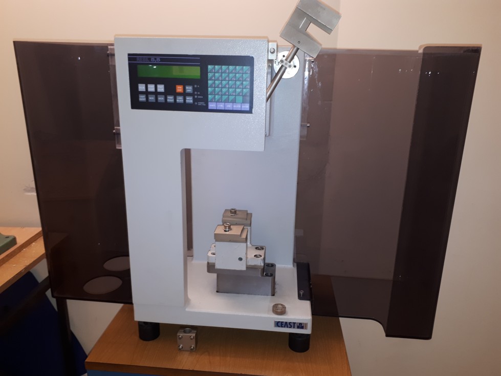 Młot Charpy'ego do badania udarności próbek polimerowych z karbem i bez karbu.