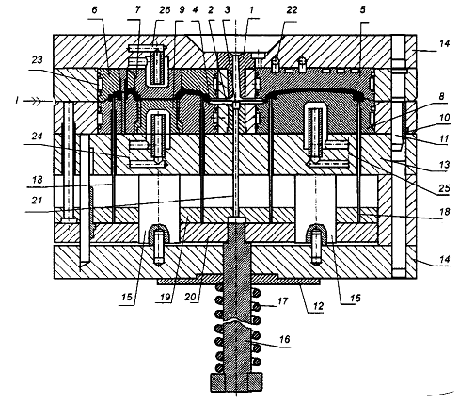 1- tuleja wlewowa, 2- kanał wlewowy, 3- zaczep wlewka, 4- przewężka, 5, 6,7- wstawki formujące matrycy, 8, 9- wstawki formujące stempla, 10- tuleja prowadząca, 11- kołek prowadzący, 12- pierścień centrujący formę, 13- płyta podpierająca, 14- płyta mocująca, 15- tuleje podpierające, 16- zderzak, 17- sprężyna powrotna zderzaka, 18- wypychacze, 19- płyta wypychaczy, 20- płyta podpierająca wypychacze, 21- wypychacz wlewka, 22 - 26- kanały chłodzące