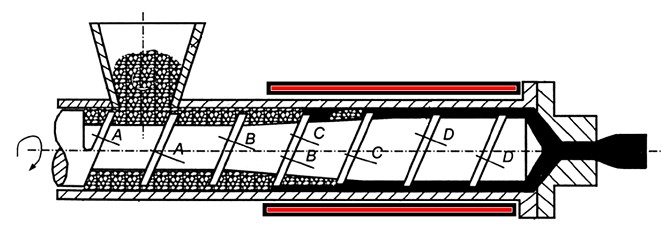 Tworzywo polimerowe w postaci granulatu lub proszku podawane jest do leja zasypowego wytłaczarki (zasobnika), skąd grawitacyjnie (najczęściej, lub za pomocą odpowiednich podajników ślimakowych) transportowane jest do cylindra. W cylindrze w wyniku ciągłego ruchu obrotowego ślimaka materiał jest transportowany (transport wleczony) w kierunku głowicy. W pewnym momencie tworzywo dostaje się do ogrzewanej strefy cylindra, gdzie ulega stopieniu, a następnie homogenizacji materiałowej i termicznej. Jednorodny stop podawany jest z odpowiednią prędkością do głowicy, gdzie materiał jest formowany, przyjmując kształt ustnika.