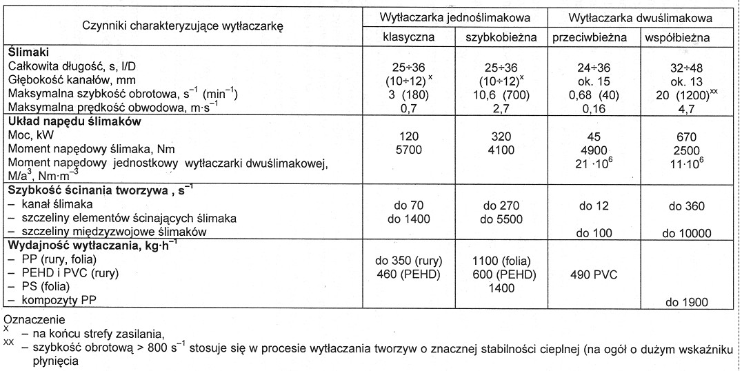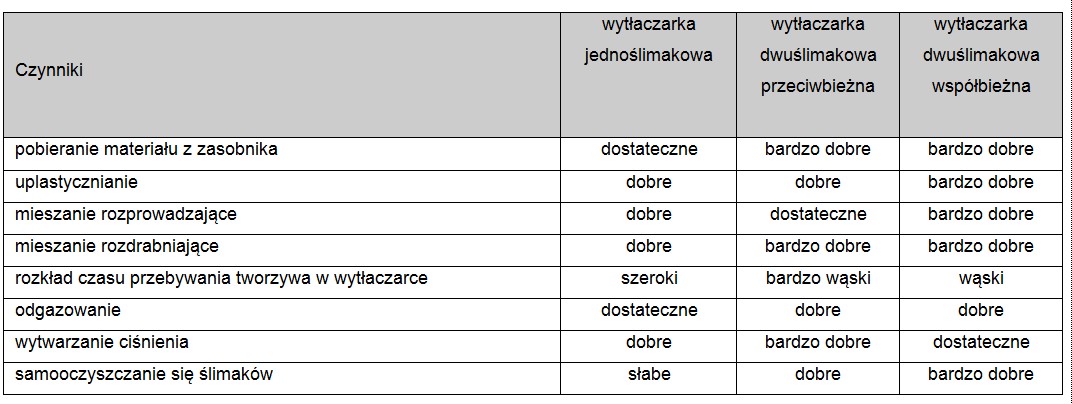 Porównanie działania układów uplastyczniających wytłaczarek jednoślimakowych oraz dwuślimakowych współbieżnych i przeciwbieżnych przedstawiono w poniższych tabelach.