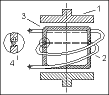 1-płyty dociskowe, 2-cewka indukcyjna, 3-pierścień metalowy, 4-przedmiot zgrzewany