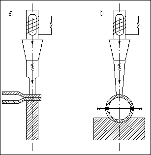 Zasada zgrzewania ultradźwiękowego bezpośredniego (a), oraz zgrzewania ultradźwiękowego pośredniego (b):