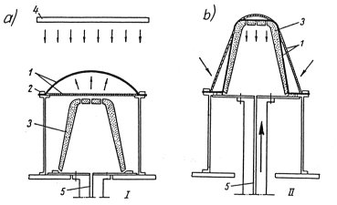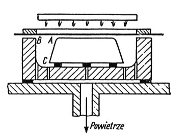 1- rama obciągająca, 2- folia z tworzywa sztucznego, 3- forma pozytywowa, 4- otwory łączące przestrzeń formowania z komorą próżniową (e 0,3 - 0,5 mm)