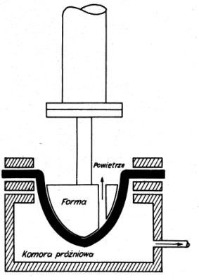 a - nagrzewanie i rozdmuch, b - ruch stempla do góry, rozciąganie mechaniczne, a następnie formowanie próżniowe