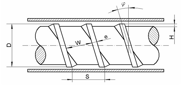 Najważniejsze parametry geometryczne ślimaka wytłaczarskiego przedstawiono na poniższym rysunku:
