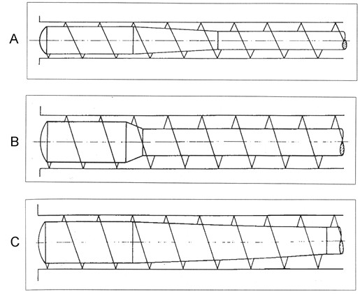 Typowy ślimak trójstrefowy (A), ślimak trójstrefowy z krótką strefą sprężania (B) oraz ślimak dwustrefowy z długa strefą sprężania (C) |