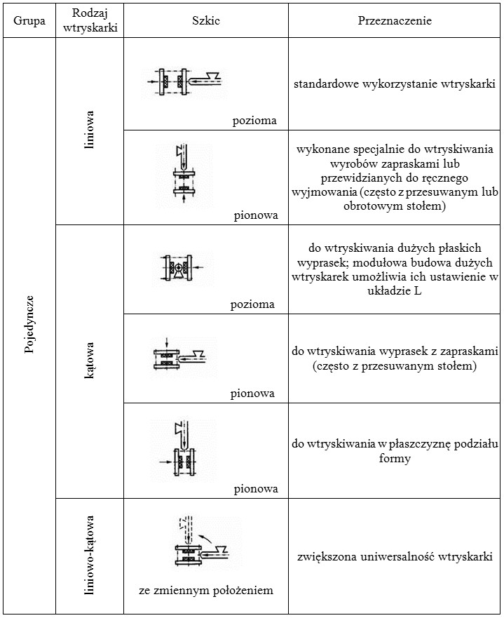 Zależnie od potrzeb, wzajemne położenie i liczba dwóch pierwszych zespołów determinuje wielkość i kształt korpusu. Wyróżnia się wtryskarki o liniowym poziomym i pionowym ułożeniu zespołów zamykania i agregatu wtryskowego. Wtryskiwanie jest wówczas realizowane przez stół nieruchomy wtryskarki. Natomiast przy ułożeniu kątowym, również poziomym lub pionowym, wtryskiwanie jest dokonywane bezpośrednio w płaszczyznę podziału formy.