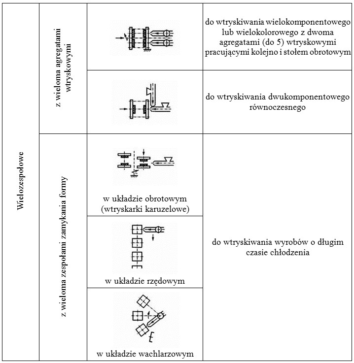 Do wtryskiwania wielokomponentowego lub wielokolorowego stosowane są wtryskarki z wieloma agregatami wtryskowymi. Do już wykonanego fragmentu wypraski dotryskiwany jest następny jej fragment, potrzebne jest w tym przypadku przemieszczenie wypraski do kolejnej formy przez obrót stołu ruchomego. Do produkcji bardzo grubych wyrobów stosuje się jeden agregat wtryskowy, ale wiele obrotowych lub przesuwnych zespołów zamykania.