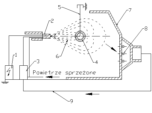 1 - generator wysokiego napięcia prądu stałego, 2 - głowica napylająca , 3 - zbiornik na tworzywo, 4 - przedmiot, na który nanosi się tworzywo (uziemiony), 5 - wieszak na przedmiot, 6 - pole elektryczne , 7 - obudowa kabiny, 8 - odciąg odpylający, 9 - przewód do odzyskanego proszku