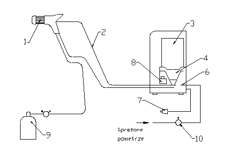 1 - pistolet nanoszący , 2 - przewód doprowadzający tworzywo w strumieniu sprężonego powietrza , 3 - zbiornik tworzywa , 4 - lej , 5 - inżektor , 6 - dysza , 7 - włącznik elektryczny , 8 - wibrator ułatwiający zabieranie tworzywa , 9 - butla gazu palnego , 10 - reduktor