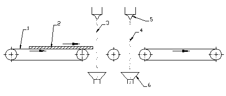 1 - przenośniki taśmowe , 2 - przedmiot do nanoszenia , 3 - strumień modyfikowanej żywicy poliestrowej , 4 - strumień środków pomocniczych , 5 - dysze szczelinowe , 6 - leje odbierające