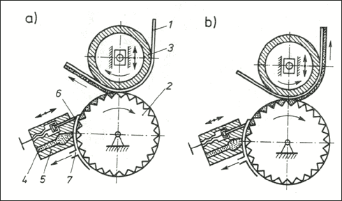 Schemat procesu nanoszenia wymuszonego: a - listwowego, b - dwuwalcowego